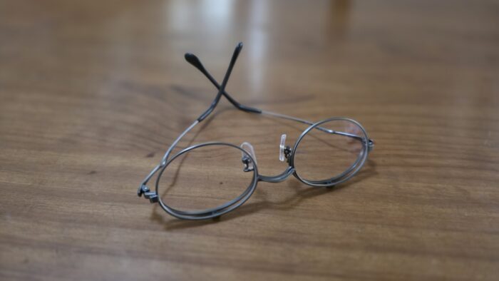 普通のレンズは日常使いなので近くは裸眼で見るよう楕円形の跳ね上げで作り、もう一つは円形フレームにしました。